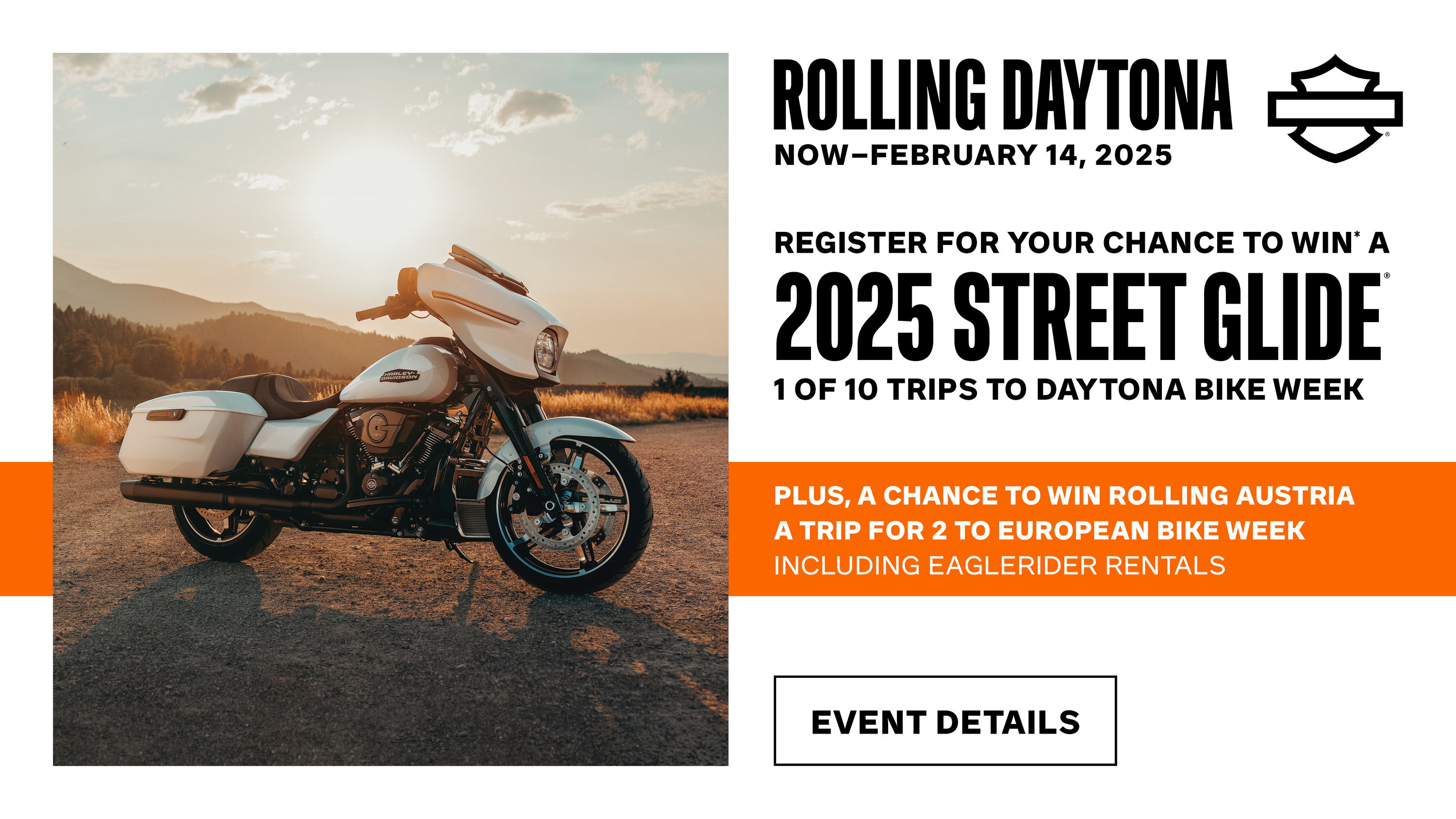 * NO PURCHASE/PAYMENT NECESSARY. Enter from 1/3/25 - 2/14/25 at local participating dealer. You must be legal US (excluding Hawaii) resident, 21+. Enter at local participating dealer. Each entry will automatically be entered into a single pooled drawing of entrants in Rolling Daytona, Laconia, Milwaukee-to-Sturgis, Ride Into 2025, H-D Spring Event, Test Ride Days and June Flex Event for 1 Rolling Austria Prize. Qualifiers & secondary prize winners determined on or around 2/17/25. Qualifiers for motorcycle prize must attend Live Giveaway Event in person on 3/8/25 for a chance to win. Motorcycle Prize winner must pay tag/title/dealer & fees prior to prize receipt. Potential winners for all other prizes must respond within 48 hours of email from Mighty Loud to win. Approximate value of all prizes: $67,799. Other restrictions and eligibility limitations apply. See full rules (available at participating H-D® dealers or online at rollingusa.com) for prize descriptions, odds, entry methods, pooled drawing details & other information. Sponsor/Operator: Mighty Loud, Inc. Void where prohibited.